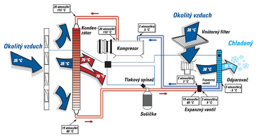- The refrigerated coolant is transported to an evaporator with a temperature of around -1°C, and from there it is lead through air channels to the vehicle’s cabin.